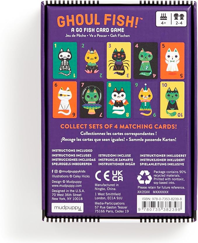 - GHOUL FISH! CARD GAME – Ghoul Fish! from Mudpuppy is a spooky spin on the classic game of Go Fish. Collect the most sets of 4 matching cats to win a purr-fect game for Halloween boo baskets!