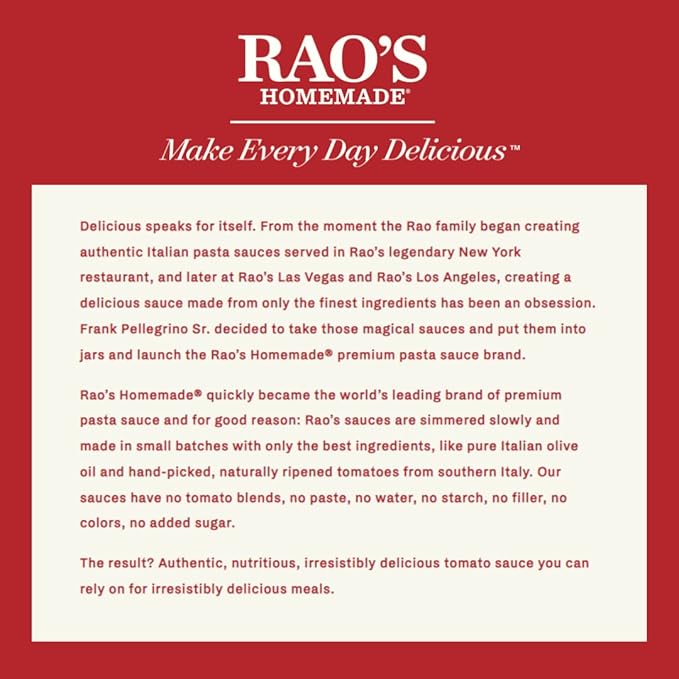 - ALL NATURAL, PREMIUM QUALITY: Rao's Homemade Marinara Sauce is a premium, slow-cooked, all-purpose Italian pasta sauce. Each jar brings you the warm, classic flavor of homemade tomato sauce.