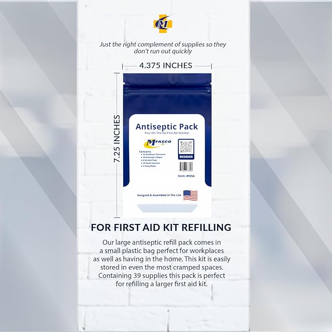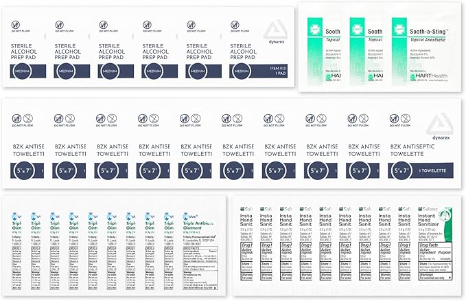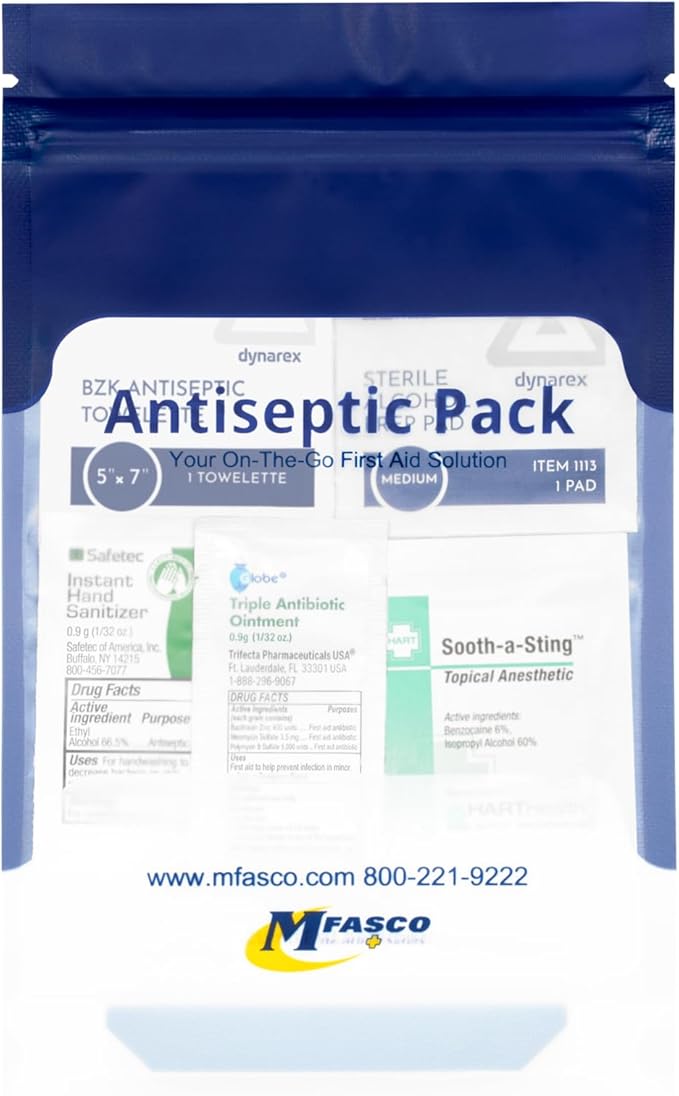 - Included Components : 6 Antibiotic ointment 6 Antiseptic wipes 6 Alcohol pads 6 Hand sanitizer 3 Sting Wipes