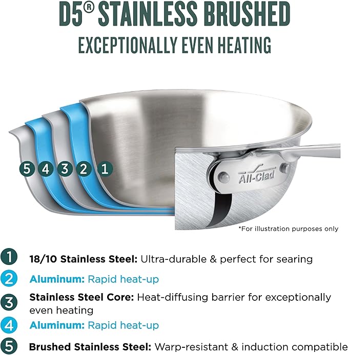 All-Clad D5 Brushed 5 Ply Stainless Steel Cookware Set 10 Piece w/ Frying Pans, Pots and Pans Set, Induction, Oven Broiler Safe 600F, Silver