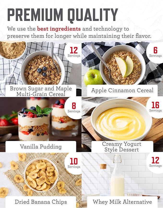 - NUTRITIOUS MEALS: Our survival food kit offers not only convenience but also tasty, nutrient rich options, such as freeze dried banana chips, pasta alfredo, tomato basil soup, our whey milk alternative, & more to enhance your outdoor meals reliably.