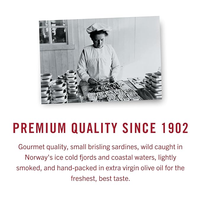 - PREMIUM QUALITY SINCE 1902: These premium brisling sardines are tiny sardines from Norway’s pristine, icy fjords and coastal waters. We catch smaller fish for the best taste and texture, naturally wood smoked, and hand-packed to ensure quality.