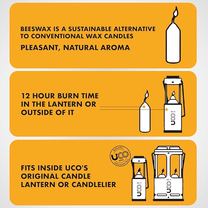 - Survival Candle Pack: Designed for UCO Candle Lanterns, these 100% beeswax candles are perfect for camping, hiking, and survival kits. A must-have for power outages and emergency preparedness.