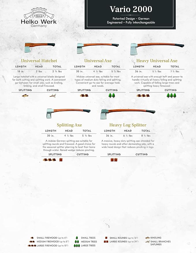 - Patented Interchangeable Head Design: with C50 High Carbon Steel - 53-56 HRC - The Vario uses Helko Werk's patented axe design - a German engineered bolt-on fastening system that introduces incredible versatility and efficiency across the Vario product line. All Vario heads, handles, and fastening components are fully interchangeable and inter-compatible. The heads are assembled with bolts which are driven through the handle and secured by a butt-plate retainer cap.