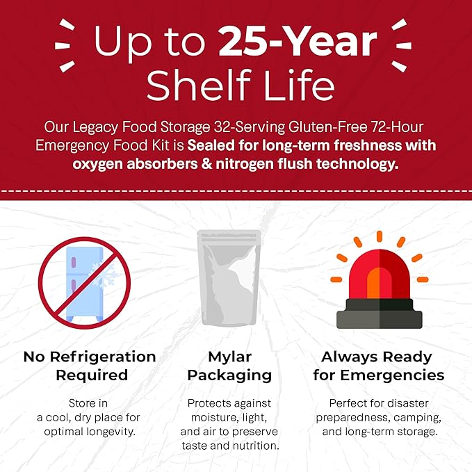 Legacy Food Storage Gluten Free 3 Day Kit, Emergency Food Supply, 12,080 Total Calories, 32 Large Servings, Shelf Stable, Freeze Dried Survival Meals for MRE Camping, Hiking, & Backpacking