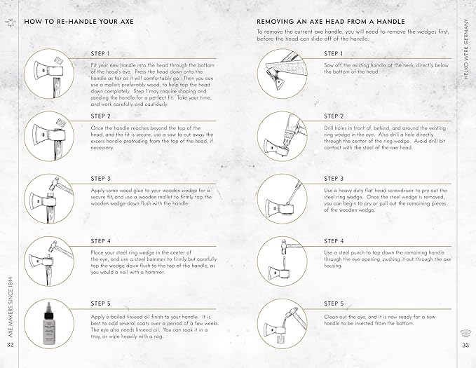 - Includes Full Grain Leather Sheath and 1oz Axe Guard Protective Oil: All Helko Werk axes and hatchets include a vegetable-tanned premium leather axe sheath to protect your axe blade and head. The Axe Guard oil is a metal protecting oil to help maintain the steel of your axe head, and prevent rust over time.