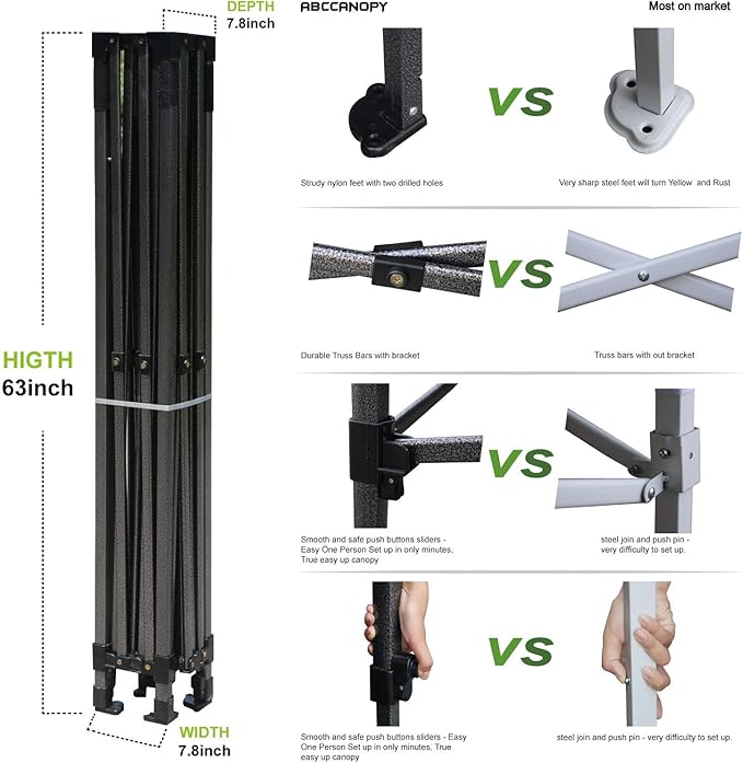 - BEST QUALITY OF FRAME AND FABRIC-The durable black-powder-coated steel, non-rust frame has nylon plastic connection hardware.Beautiful, strong and security.The latest thumb lock system,easy to lock and release.The canopy top is high-strength fabric,blocking 99% of the sun's harmful rays.Stitching lines are all seam sealed to prevent water penetrate from seams to make our canopy tent waterproof.