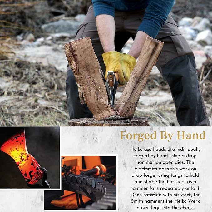 - C50 HIGH CARBON STEEL: 53-56 HRC - Helko Werk axe heads are open-face drop forged individually by hand from German C50 high grade carbon steel. Drop forging is a process in which the blacksmith uses tongs to hold and shape hot steel as a drop hammer falls repeatedly onto it.