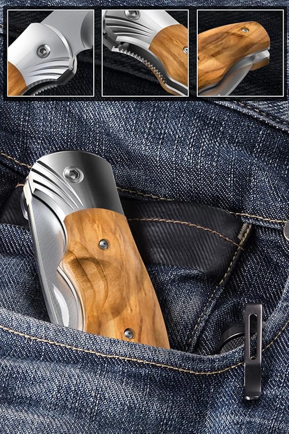 - Sharp Pocket Knife: The folding flipper style and wooden handle add to its utility and safety. Outdoor enthusiasts will appreciate its razor-sharp edge, and collectors will find it a unique and attractive addition to their tools. Easy to carry in your pocket, this collectible knife is the best personal cutter for any situation.