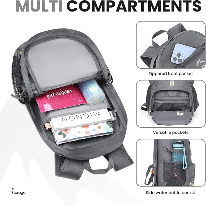 - Large Capacity & Multi Compartment: Thoughtfully designed with multiple compartments,our backpack features a main zippered section with two dividers for organized packing. Two front pockets are great for small items like charging devices, while side pockets securely hold water bottles or umbrellas—perfect for hiking, travel, or daily use