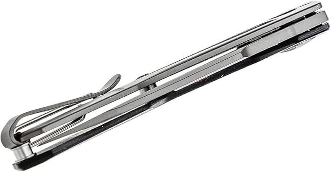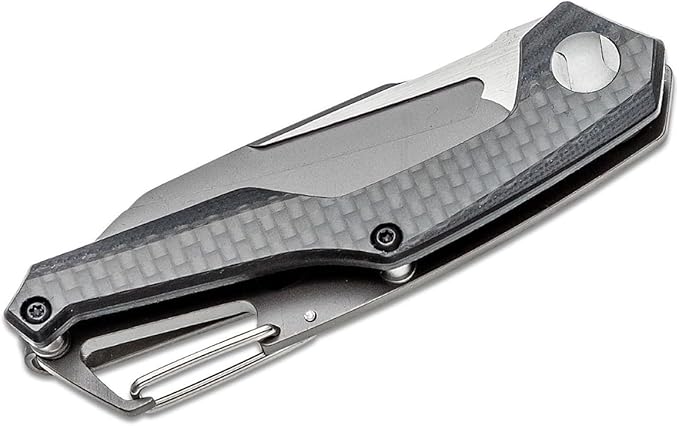 - LIGHTWEIGHT, ALL-WEATHER G10 HANDLE with carbon fiber overlay. Gray & black handle design. Includes single-position, extra deep-carry pocketclip (right, tip-up) and a built-in carabiner clip.