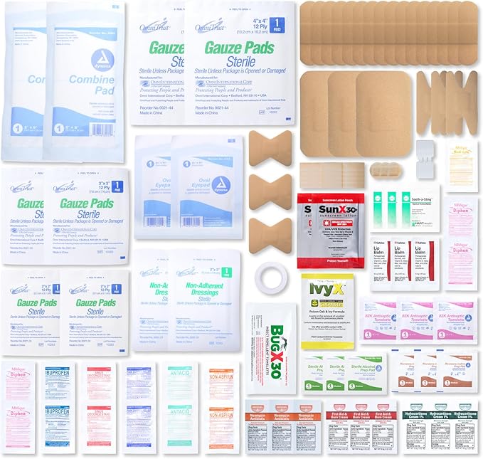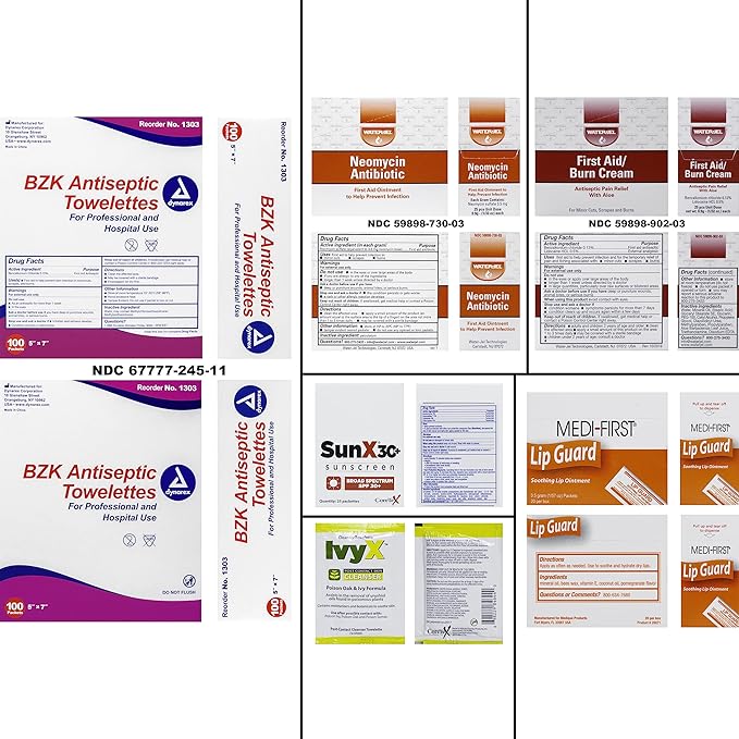 - Included Components : 3 Antibiotic ointment 3 Hydrocortisone cream 3 First aid burn cream 3 Antiseptic wipes 3 Alcohol wipes 3 PVP Wipes 16 Fabric bandage strips 3 Fingertip bandages 3 Patch bandages 3 Knuckle bandage 3 Spot bandage 3 Butterfly closures 3 Junior bandages 2 Non adhering pads 2x3 2 Surgical pads 5x9 1 Adhesive tape 2 Gauze pads 4x4 2 Gauze pads 3x3 2 Gauze pads 2x2 2 Eye pads 2 Sunscreen packets 1 Insect Repellent wipe 1 Burn gel 3 Lip guard 3 Sting wipes 1 Ivy X cleaner 4 Diphenhydramine tablet 2 Ibuprofen tablets 2 Pain relief tablets 2 Sinus decongestant 2 Antacid tablets 1 Electrolyte replacement tablet 2 Non aspirin tablets 3 Antibiotic ointment 3 Hydrocortisone cream 3 First aid burn cream 3 Antiseptic wipes 3 Alcohol wipes 3 PVP Wipes 16 Fabric bandage strips 3 Fingertip bandages 3 P… See more