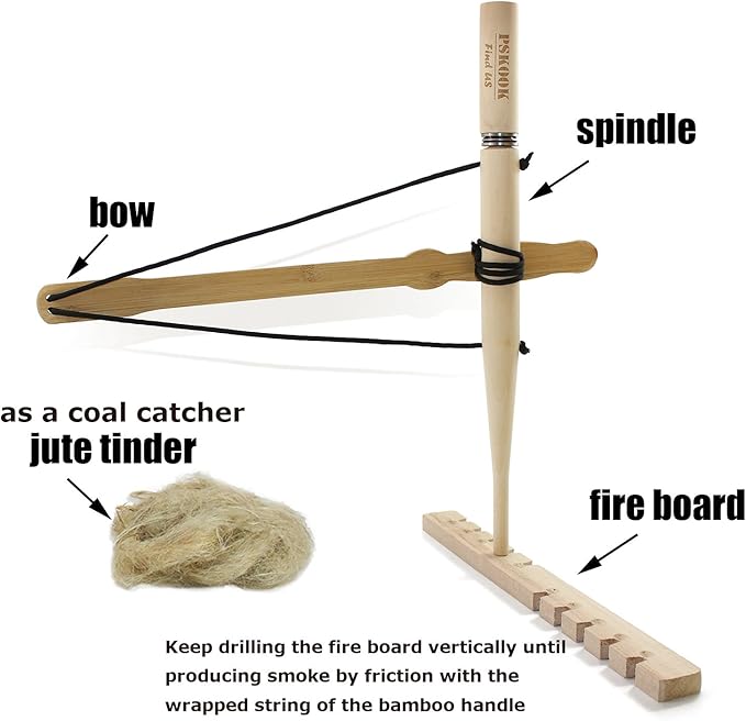 - 🔥 [EASY-TO-USE BOW DRILL FIRE STARTER KIT] Keep drilling the fire board vertically until producing smoke by friction with the wrapped sting of the bamboo handle, then you can make the fire. Whoever can quickly get started, easily experience and master the primitive fire method.