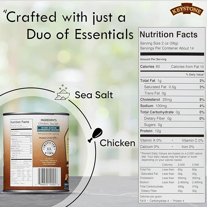 - KEYSTONE CHICKEN:- All natural premium canned chicken that is 98% fat free, has no carbs, no gluten and only has two ingredients: Chicken and Sea Salt
