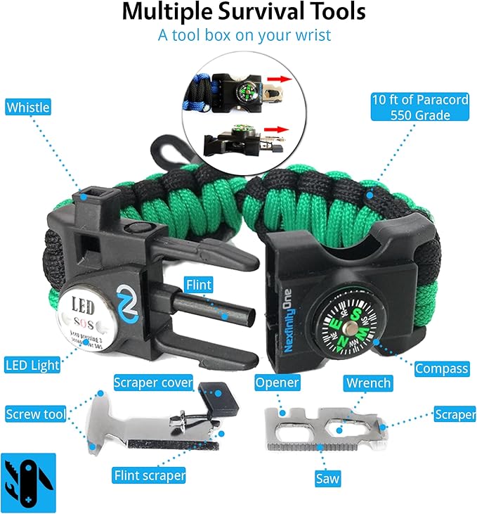 - MULTITOOLS - This survival bracelet set includes a pair of compact multi tools that fits neatly inside the buckle. The tool has screwdriver, scrapper, saw, wrench and more!