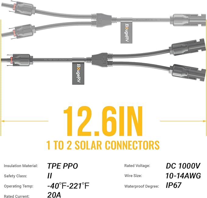 BougeRV 2 Pairs Solar Connectors Y Branch Parallel Adapter Cable Wire Plug Tool Kit for Solar Panel