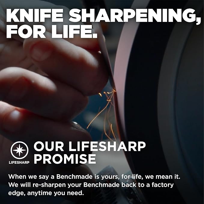 - YOURS, FOR LIFE: Benchmade will re-sharpen your knife to a factory edge for free, for the life of the knife. Benchmade LifeSharp services includes cleaning, oiling, adjustments, and re-sharpening.