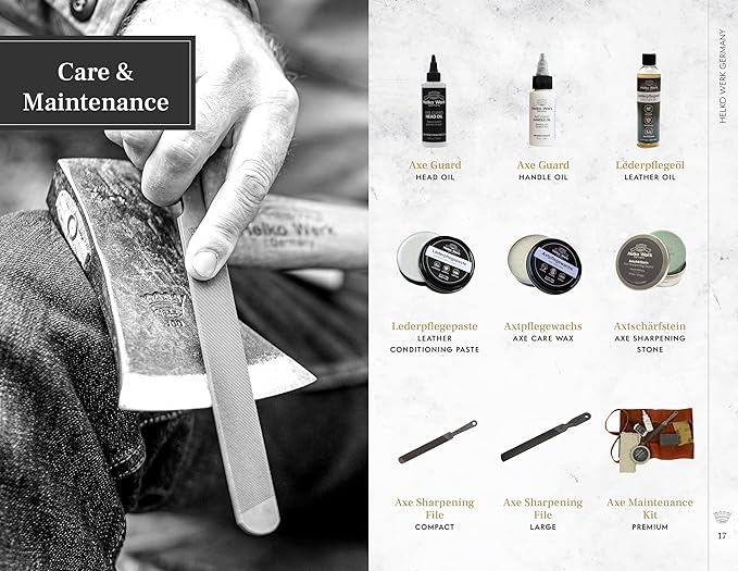 - Includes Full Grain Leather Sheath - 1 Oz. Bottle of Axe Guard Protective Oil All Helko Werk Axes include a vegetable-tanned premium leather axe sheath to protect the blade of your axes and hatchets