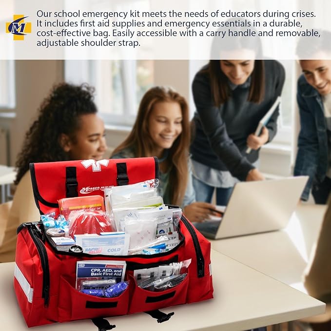 - Comprehensive School Emergency Preparedness: The MFASCO Emergency First Aid Bag ensures your school is fully prepared for any unexpected situation. Stocked with over 200 essential first aid supplies, this red trauma bag guarantees comprehensive readiness during emergencies, from minor incidents to critical situations. Assembled in USA.
