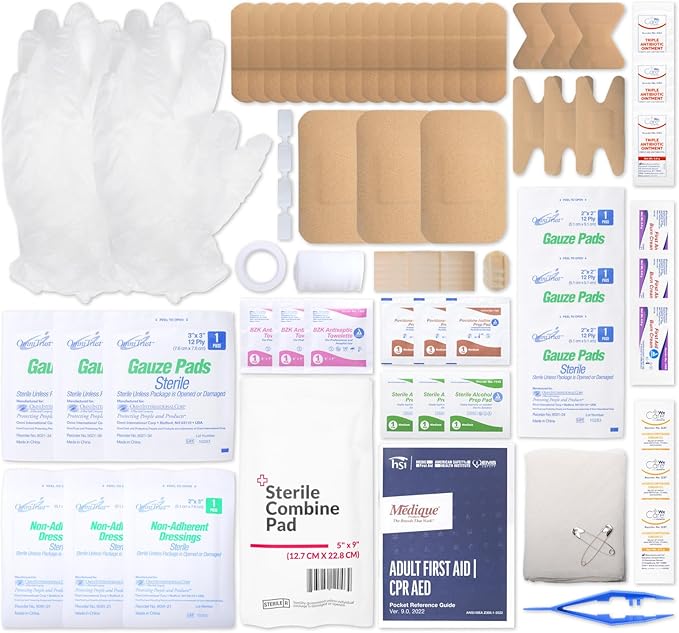 - Included Components : 5 Junior bandages 3 Spot bandages 16 Fabric bandages 1x3 3 Butterfly closures 3 Fingertip bandages 3 Patch bandages 3 Knuckle bandages 3 Alcohol pads 3 Antiseptic wipes 3 First aid burn cream 3 Hydrocortisone cream 3 Antibiotic ointment 3 PVP pads 1 First aid guide 1 Tweezer 2 pair vinyl gloves 1 Triangular bandage 1 Adhesive tape 1/2 inch 5 Junior bandages 3 Spot bandages 16 Fabric bandages 1x3 3 Butterfly closures 3 Fingertip bandages 3 Patch bandages 3 Knuckle bandages 3 Alcohol pads 3 Antisepti… See more