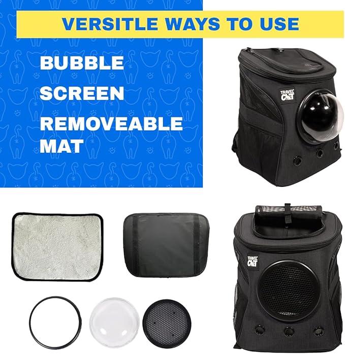 - BACKPACK CAT CARRIER WITH BUBBLE WINDOW : Included with our cat back pack is a transparent bubble window and a detachable screen attachment, giving you the flexibility to switch them as needed. Recognizing the feline fascination with observing their surroundings, our pet carrier backpack ensures that your cat can enjoy the view while safely enclosed.