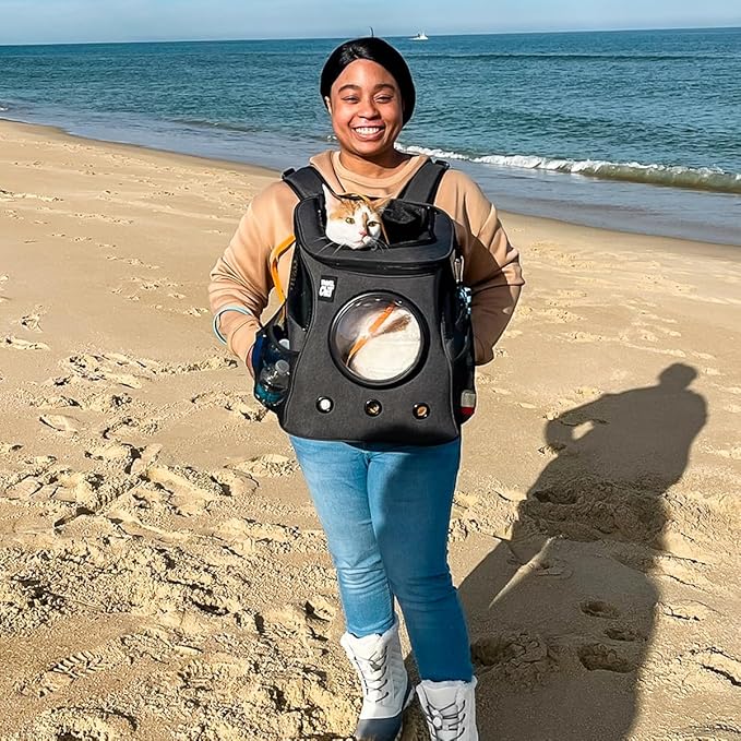 - MULTIFUNCTIONAL PET TRAVEL CARRIER : Bubble pet backpack is designed to carry not only your pet, but also all cat accessories that you may need in your travel. There are side pockets on both sides and thanks to the adjustable shoulder and chest straps, you may carry the cat bubble carrier in many ways.