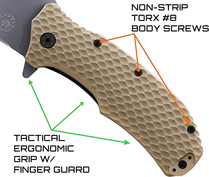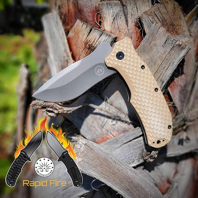 Off-Grid Knives - Rapid Fire Coyote, Large Assisted EDC, Hard Use Construction, Camping and Survival, Cryogenic D2 Blade Steel, Titanium Nitride Coating with G10 Scales, Deep Pocket Carry