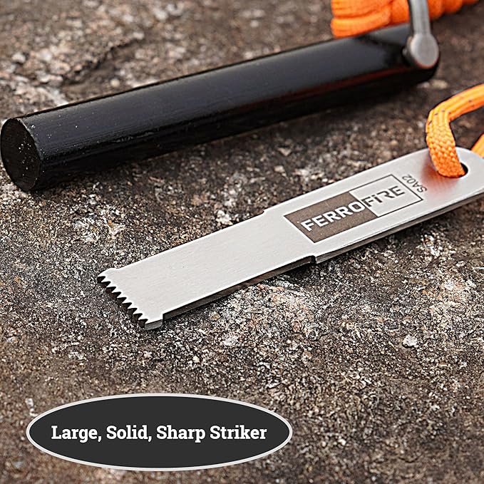 - 【Super-Duty 9/16-Inch Ferro Rod with 20,000+ Strikes】– Maximum Spark & Longevity Command superior firepower with the largest diameter 9/16-inch ferrocerium rod. Engineered for 20,000+ strikes, it produces a dense storm of 5,500°F sparks to easily ignite any tinder. Remarkably compact at 4.9oz, it's the ultimate tactical fire starter for survival, camping, and emergency prep.