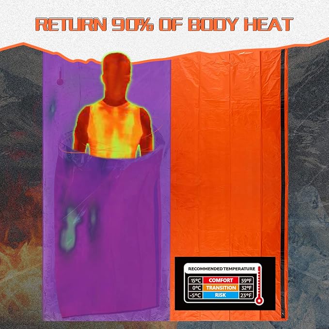 - STAY WARM OVER 24 HOURS: Made out of ultra-lightweight PE material which reflects 90% of your body's heat to you reflective, and its orange color makes it easy for rescuers to find you(And its green color is not easy to see), making it an essential survival tool, Suitable for outdoor camping and hunting, emergency shelter or car emergency kit.