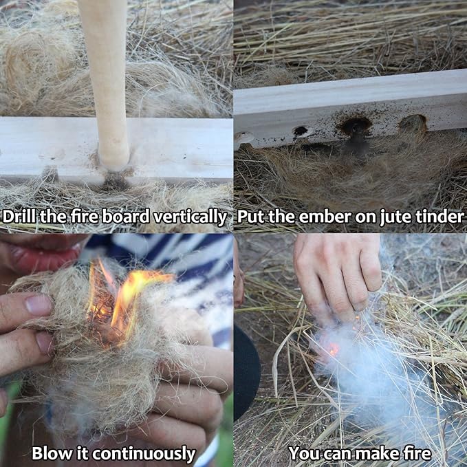 - 🔥 [EASY-TO-USE BOW DRILL FIRE STARTER KIT] Keep drilling the fire board vertically until producing smoke by friction with the wrapped sting of the bamboo handle, then you can make the fire. Whoever can quickly get started, easily experience and master the primitive fire method.
