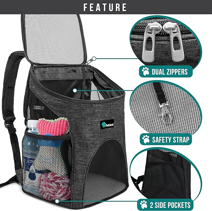 PetAmi Small Dogs and Cat Backpack Carrier, Airline Approved Pet Backpack Carrier, Ventilated, Safety Strap, Buckle Support Designed for Hiking Travel Camping Outdoor, Max 18 lbs (Dark Gray)