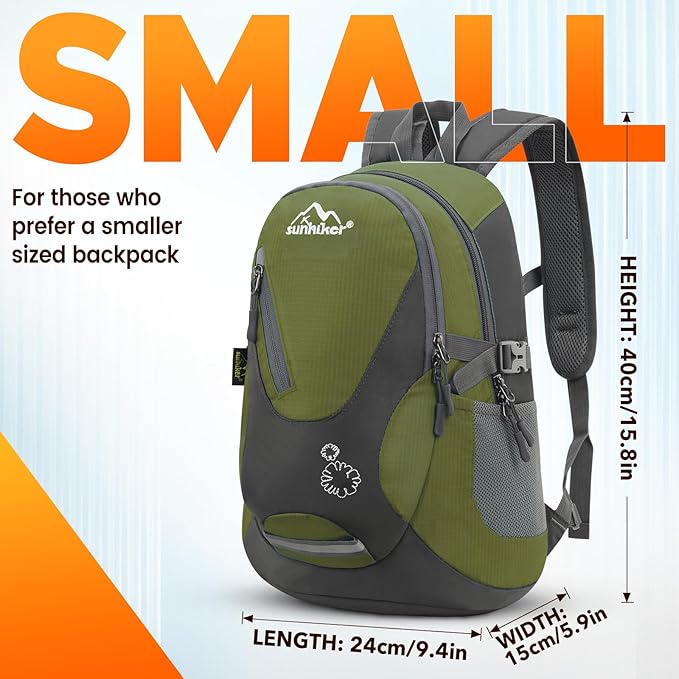 - IMPORTANT PRODUCT IMFORMATIONS: The sunhiker backpack is a small-sized backpack with dimensions of 15.8H x 9.4L x 5.9W inches/40 x 24 x 15 cm, a weight of 12.3 oz, and a capacity of approximately 20-25L. It is suitable for both men and women who prefer a smaller sized backpack and only want to carry essential items while traveling light. This size is also suitable for children above aged 3. Please make sure that it is the size what you need/want before purchasing.