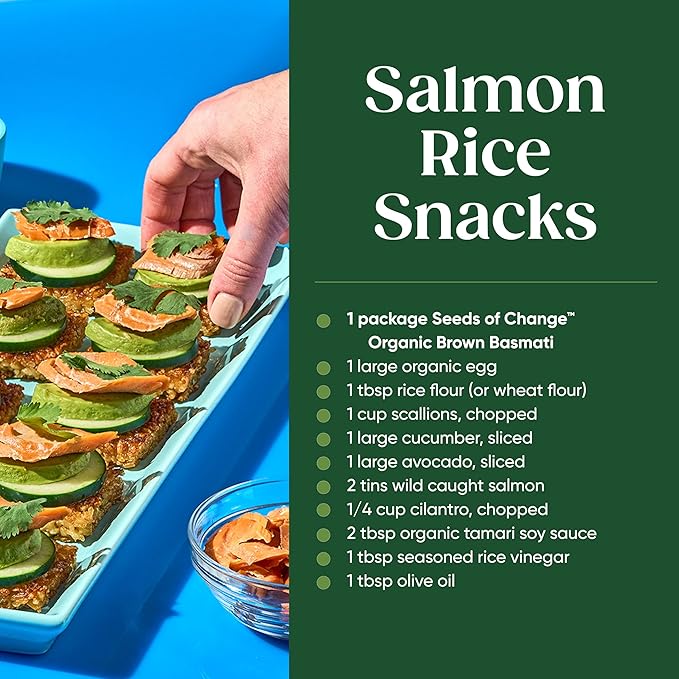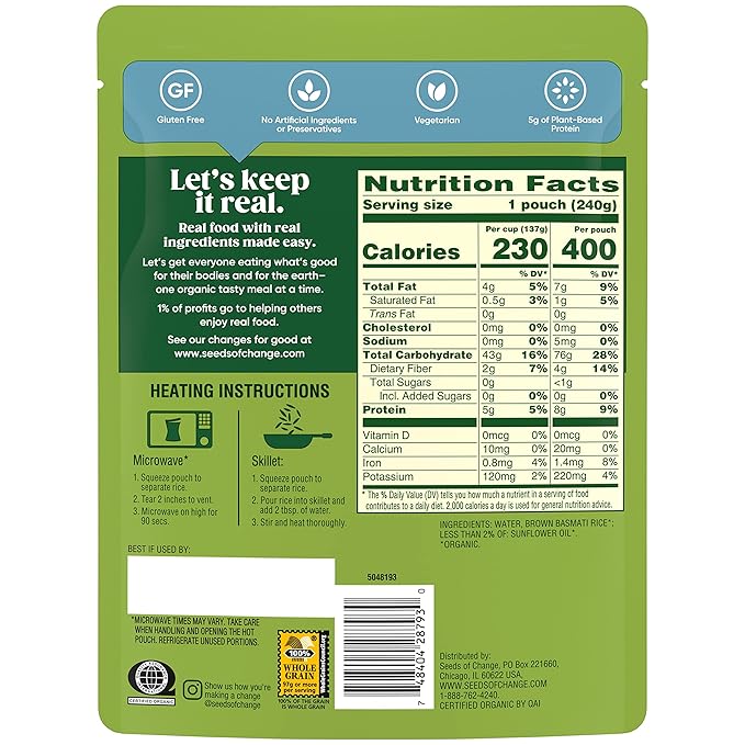 - Six 8.5 OZ pouches of SEEDS OF CHANGE Certified Organic Brown Basmati Rice