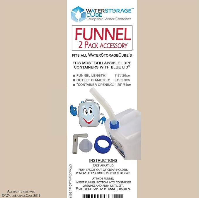 - Includes 2 funnel spouts to be used with WaterStorageCube brand of Cube collapsible water containers (not bags). Fits all 3 sized containers 1.3g/5L 2.6g/10L 5.3g/20L