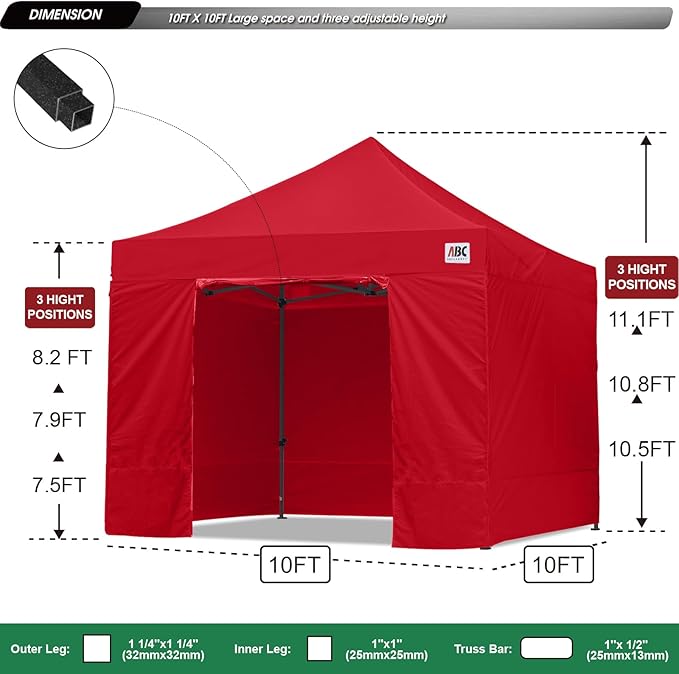 - ABCCANOPY-professional and cost-effective: ABCCANOPY is the pop up canopy brand based in the USA, has professional tent specialist, design and sell the most professional and cost-effective canopy tent, deeply trusted by the American people. This model include more necessary accessories and useful panels,perfect for any occasion. The 100 square feet of cool shade big enough for about 6 or 8 people, with plenty of room for a table and chairs.