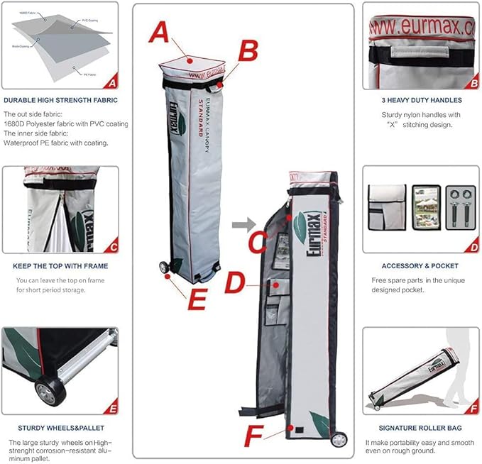 - Canopy Tent Roller Bag: Eurmax unique L shaped roller bag is oversize designed, it is easy to put frame and top in the bag. Big wheels, extra pockets for additional items, Heavy duty strong polyester fabric, 2 layer fabric sewed, reinforced handles, all these makes the bag long lasting.