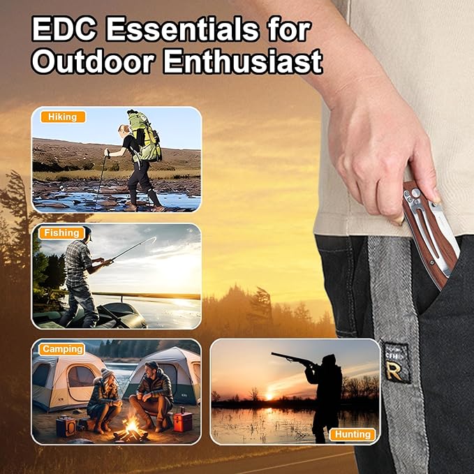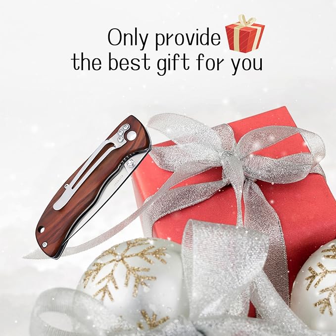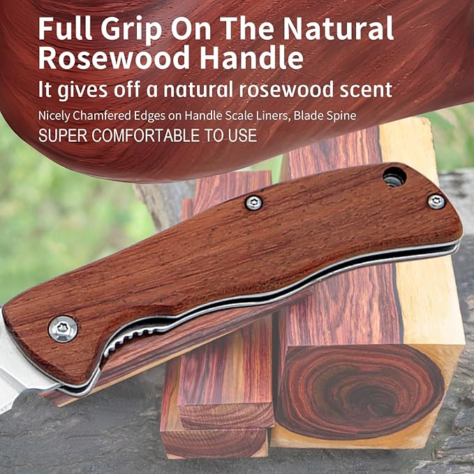 - COMFORTABLE ERGONOMICS ROSEWOOD HANDLE--Made of high-quality natural rosewood which brings you comfortable and perfect anti-slip grip, and the wood handle with excellent workmanship provides exquisite look and upscale texture, so this pocket knife is the best gift for men and women
