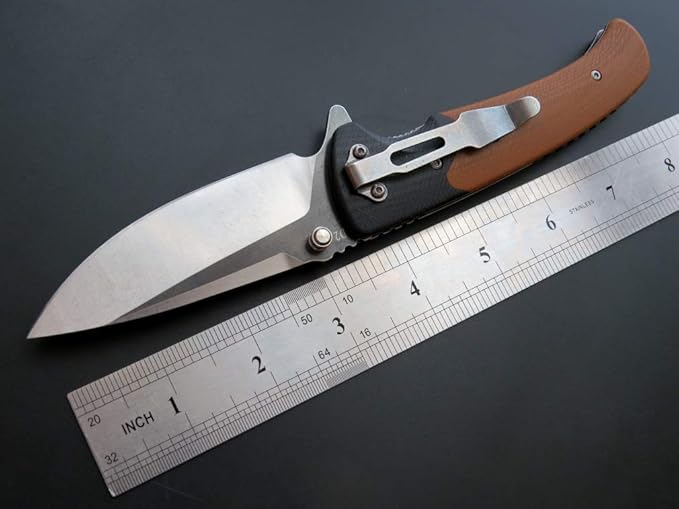 - 8.2 inch flipper knife with 3.5 inch D2 stone wash drop point blade and 4.7 inch G10 non-slip handle.Net weght:5.5 oz.