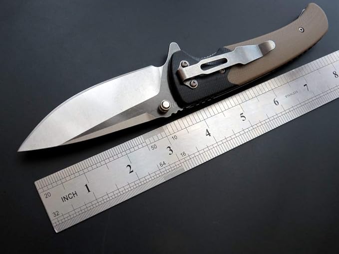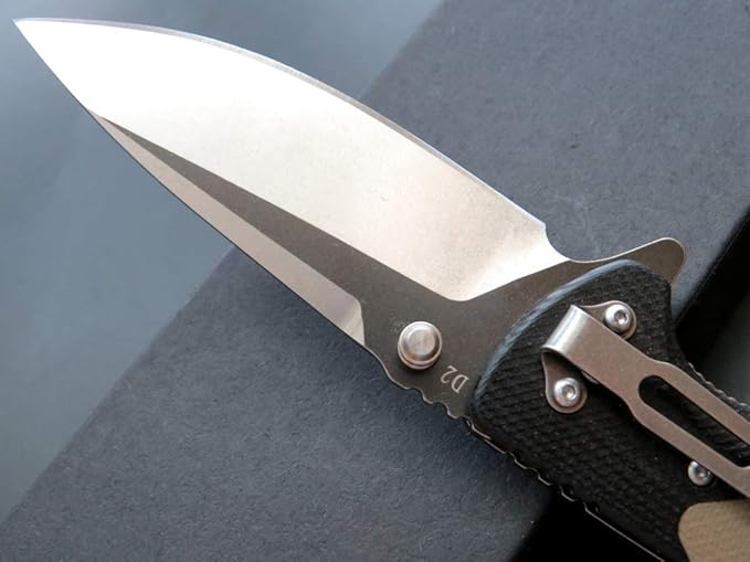- 8.2 inch flipper knife with 3.5 inch D2 stone wash drop point blade and 4.7 inch G10 non-slip handle.Net weght:5.5 oz.