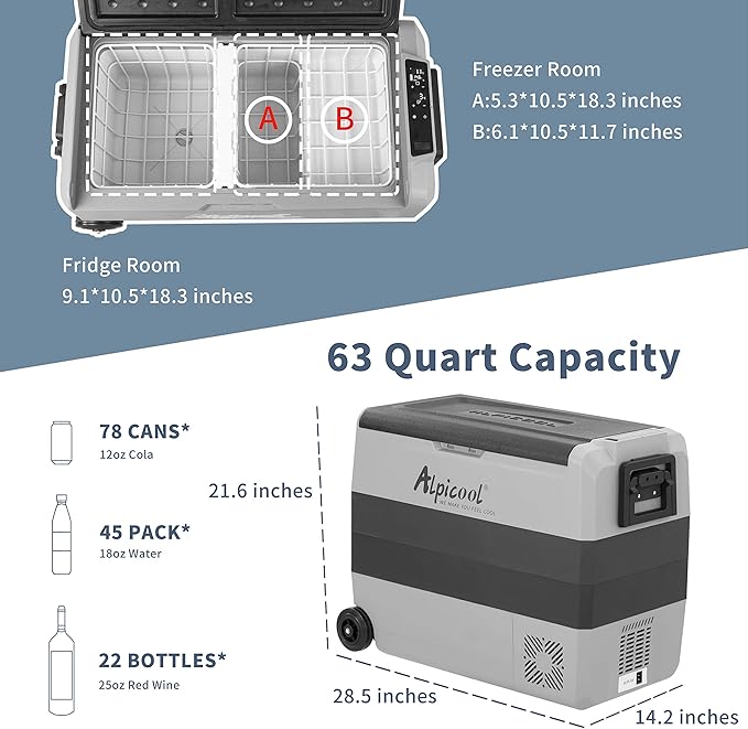 Alpicool T60 Dual Temperature Control 12 Volt Refrigerator 63 Quart Portable Car Fridge Freezer (-4°F~68°F) for Truck, RV, Boat, Camping and Travel
