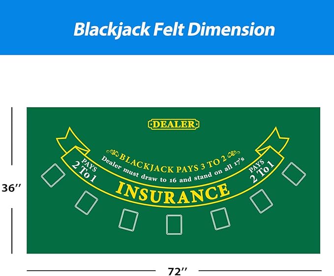 - The blackjack layout felt measures 72"L x 36"W; It can easily turn any ordinary kitchen or dining table or pool table into a blackjack table