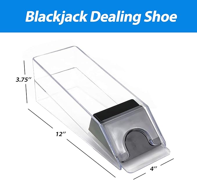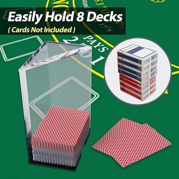 - The 8-deck blackjack shoe is made from acrylic with smooth and rounded edges; The shoe holds up to 8 decks of playing cards; The steel roller of weighted wedge weights up to 0.5 pounds, ensures that the cards in the shoes can receive even pressure for smooth and easy card dealing, and the cards slide out of the slot with ease