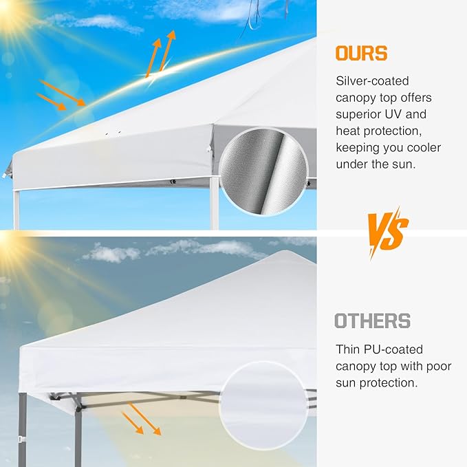 - HEAVY DUTY TOP WITH VENTED DESIGN: The EAGLE PEAK canopy features a CPAI-84 rated 150D silver-coated oxford top with double-stitched and heat-sealed seams for long lasting waterproof performance. This durable pop up canopy provides UPF 50+ sun protection and a large vent at the peak to release heat; ideal for staying cool at outdoor events, markets, or backyard gatherings