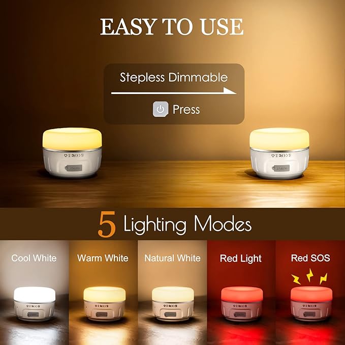 - ✅【5 lighting Modes & Stepless Dimming】Enhance your outdoor experience with our portable rechargeable camping lantern. Adapt to any setting with five lighting modes, including natural white, warm white, cool white, red strobe, and red SOS. Adjust brightness seamlessly with stepless dimming, . Illuminate your adventures with customizable and long-lasting light.