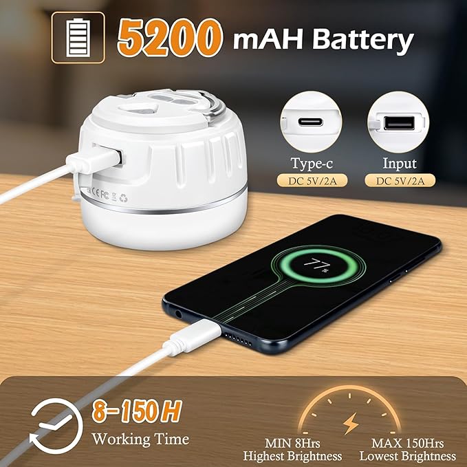- ✅【5200mAh Capacity Battery】Rechargeable Camping light is equipped with a high-quality 5200mAh battery, this Led lantern not only provides reliable illumination but also serves as a convenient emergency power supply for charging mobile devices, providing up to 150 hours of low-brightness illumination for extended outdoor adventures .