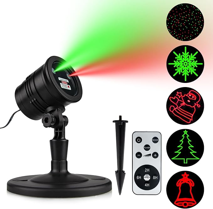 - Christmas Laser Lights with 5 Patterns, Snowflake, Jingling Bell, Christmas tree, santa claus, Starry. Red, Green laser blinking on the wall, ceiling, lawn, perfect for Christmas, holiday entertainment, parties, landscape decorations.