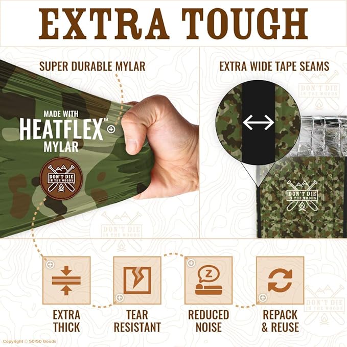 - TOUGHEST MYLAR SLEEPING BAG ON EARTH – Our tear-resistant, extra-thick HeatFlex mylar is stronger and more flexible than ordinary space blanket mylar. We’ve added a hood section to protect your head and reinforced tape seams to create a durable, reusable survival bivy you can use alone or to enhance your existing sleeping bag.