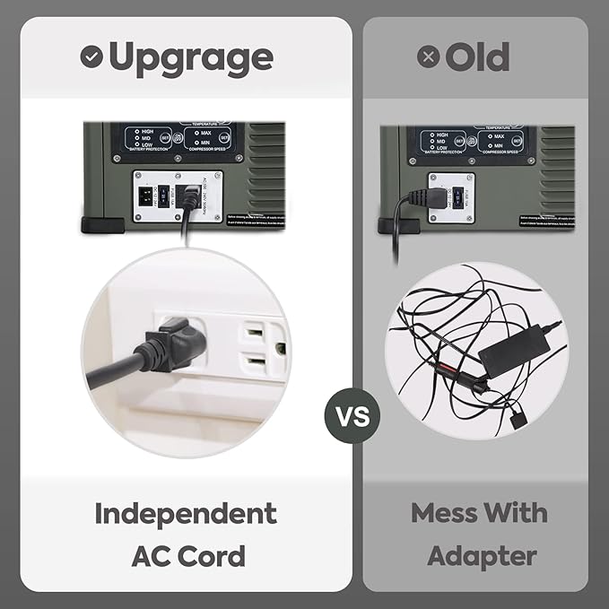 - Car and Home Use - Each portable refrigerator is equipped with a DC cord and an AC cable. Independent 12V/24V DC and 110-240V AC output port avoid chaotic wire accumulation and make the use environment cleaner and safer.