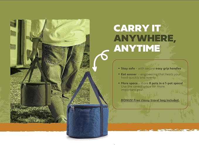 - PRACTICAL, TRAVEL-FRIENDLY- Our pots are highly portable; they come with a handy, lightweight travel bag, and features folding and removable handles for extra space. The lids have easy-grip handles for safe touching when cooking, and are stackable so that you don’t have to sacrifice room for other important gear. What’s more, the pan features a non-stick coating for mess-free cooking and cleaning.