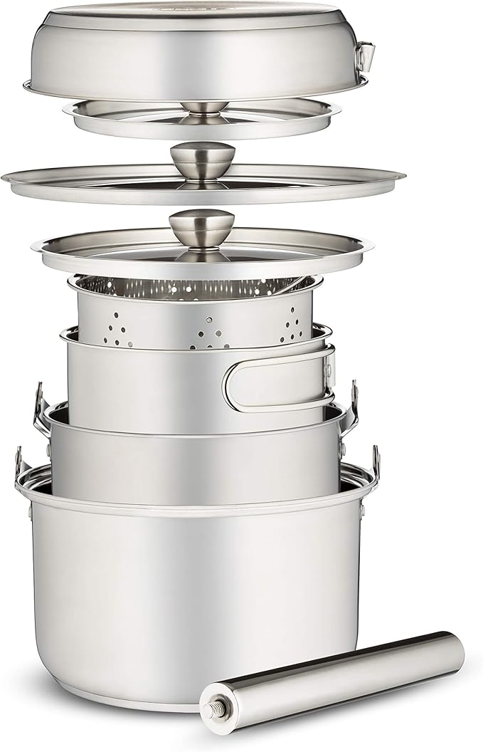 - SUPERIOR STAINLESS STEEL CONSTRUCTION- All our outdoors cooking set’s pieces are made with premium 304 Stainless Steel for extra durability and longevity. Feel absolutely free to take our cookware set on your trips and enjoy wholesome meals cooked over open fire, charcoal, wood or gas induction when you hike, camp, or take your RV to the outdoors.